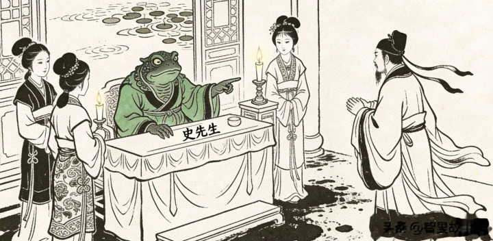 众人这才明白,昨夜那绿衣人,定是这蛤蟆精所化,那两个丫鬟,也是它的手下。魏鹤山命人将那大蛤蟆拖上岸,一把火烧了。此后,府中再无怪事发生,史先生经此一吓,大病了一场,痊愈后再也不敢轻易赴宴了。