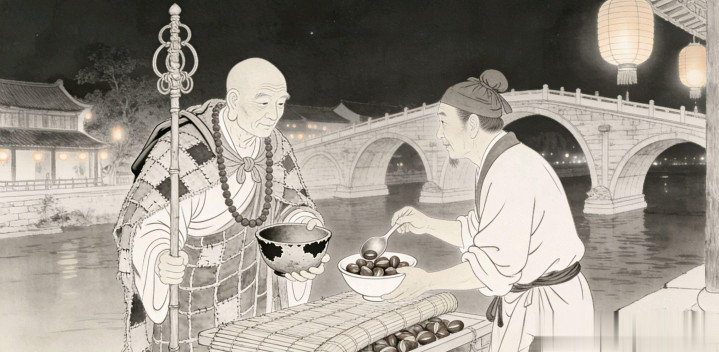 这夜,二更已过,夜市上的小贩都收了摊子,只有桥边一家炒栗铺还亮着一盏孤灯。铺主见炉中还有些热栗,便打算再等片刻,兴许还有晚归的路人来买。正低头翻炒,忽听得有人叩门,抬头一看,正是那每日化缘的行者。行者立在门口,双手合十道:“店家,化一文钱炒栗。”
